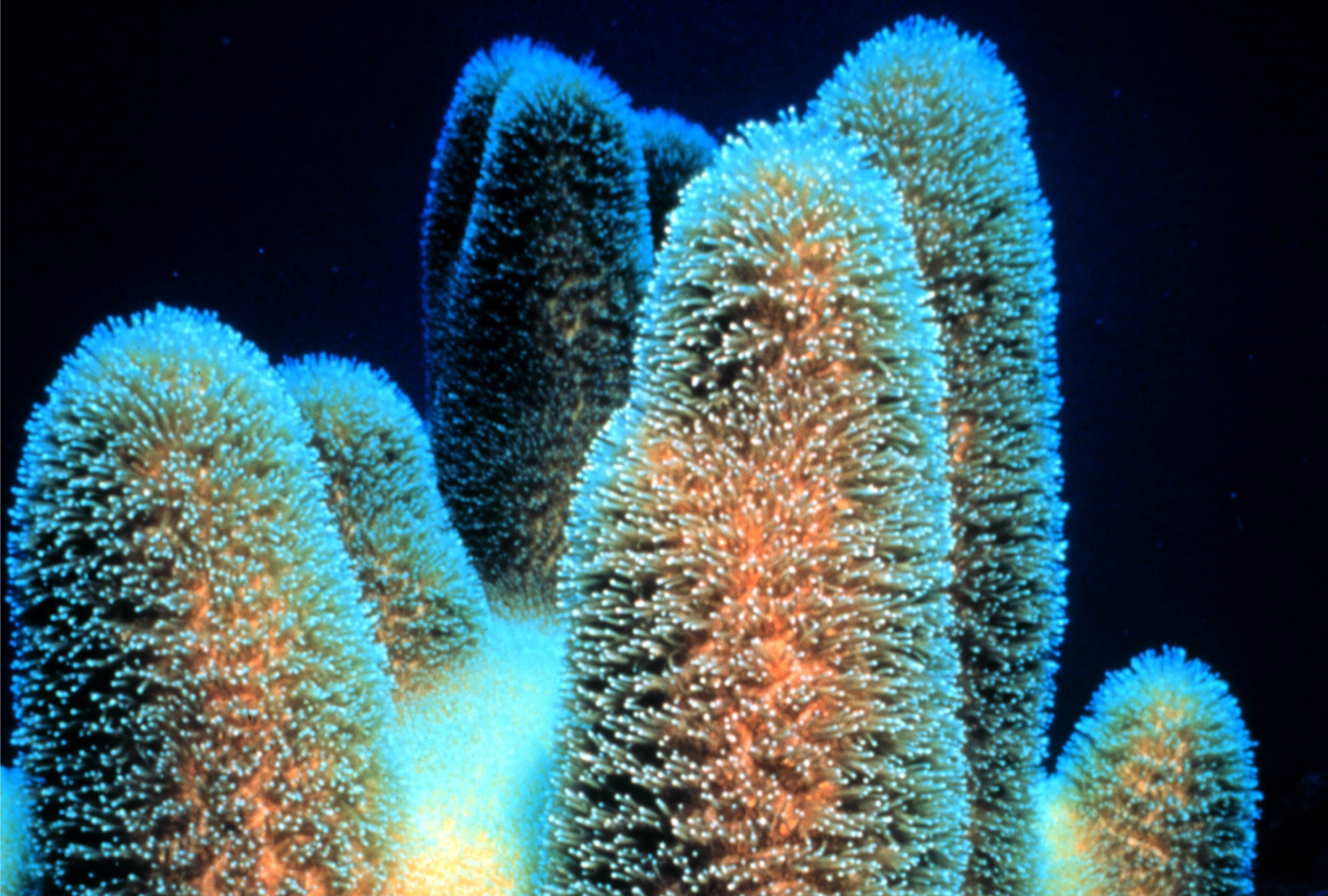Coral belongs to the class Anthozoa in the animal phylum Cnidaria, which includes sea anemones and jellyfish. Unlike sea anemones, corals secrete hard carbonate exoskeletons that support and protect the coral. Most reefs grow best in warm, shallow, clear, sunny and agitated water. Coral reefs first appeared 485 million years ago, at the dawn of the Early Ordovician, displacing the microbial and sponge reefs of the Cambrian.